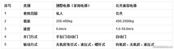 1、家用电梯与一般意义乘客电梯的区分(见下对照表)