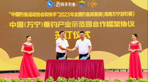 中国钓鱼运动协会秘书长苏宝生、万宁市委常委、市人民政府副市长叶楠代表双方签订《中国(万宁)垂钓产业示范园合作框架协议》。