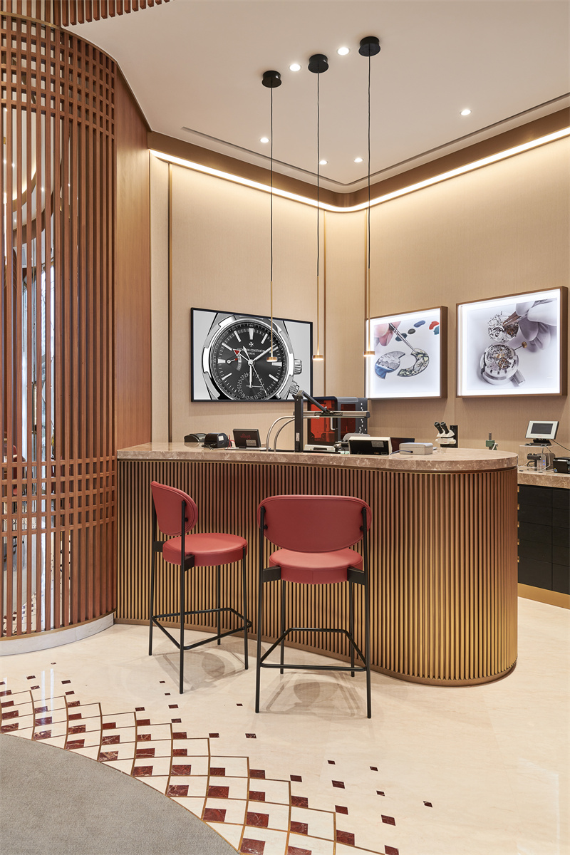 特别的是,品牌首次采用鱼鳞纹样式的金属质感屏风,片片点缀充满意趣。而店内菱形格纹的红色大理石地砖错落有致,同样是首次启用,均匀地环绕装饰在展柜周边,打造别具一格的光晕视效。步入店内,映入眼帘的背景墙呈现出马耳他十字图案,线条不断向外延伸,与外立面的设计元素巧妙呼应,象征着品牌对高级制表艺术的不渝传承。