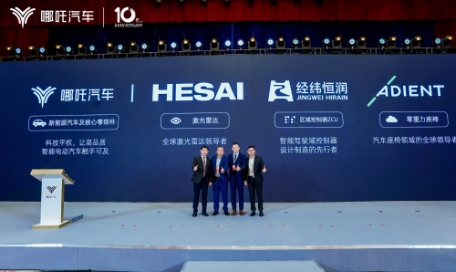 【图1:哪吒汽车携手禾赛、经纬恒润、安道拓,联合技术发布】