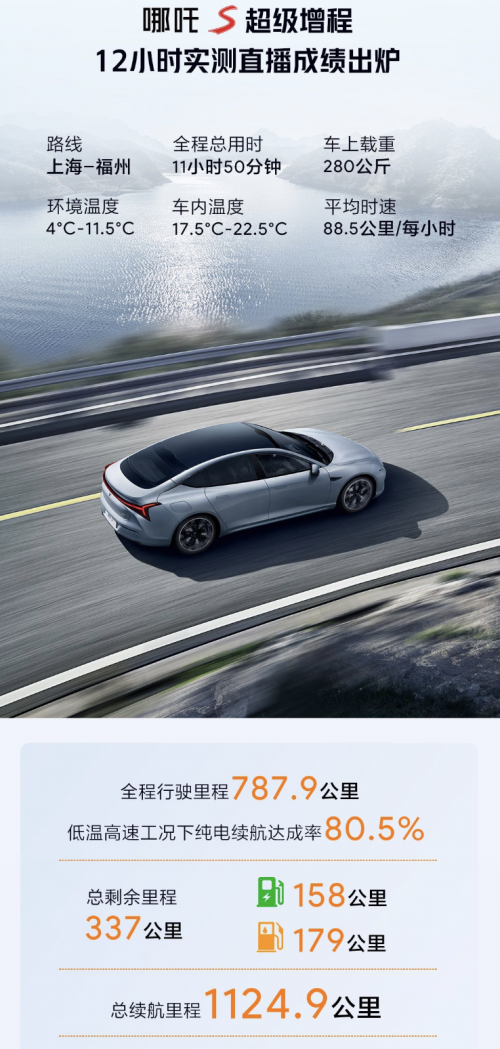 此次直播中,5位测试者接力驾驶超级增程的哪吒S 1160版,从哪吒汽车上海全球总部出发,跨越787.9公里,历时11个小时50分钟,安全抵达福州。此次测试以用户真实驾驶场景推进:出发时,车辆满电满油;出发后,全程开启空调,车内人员、设备等约载重280公斤,平均车速维持在100km/h左右;到达福州时,车辆纯电续航还剩158公里,燃油剩余里程179公里,折算最终实际续航1124.9公里,折算平均油耗6.8L/100km,发电机最高系统效率大于97%。