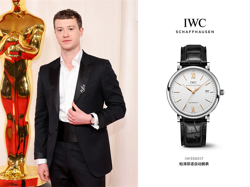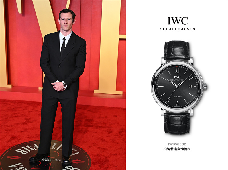 卡勒姆·特纳 (Callum Turner) 佩戴IWC万国表柏涛菲诺自动腕表出席第96届奥斯卡颁奖典礼名利场派对,精钢表壳搭配黑色鳄鱼皮表带,凸显简约大气的品味与格调。