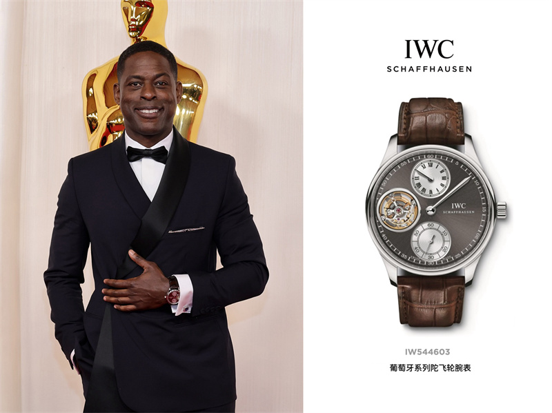 斯特林·K·布朗 (Sterling K. Brown ) 佩戴IWC万国表葡萄牙系列陀飞轮腕表登上第96届奥斯卡颁奖典礼名利场派对,白金表壳、炭灰色表盘搭配深棕色鳄鱼皮表带并配有陀飞轮复杂功能,贵气十足,于腕间诠释IWC万国表高级制表的美学理念。
