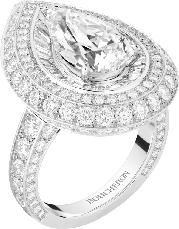 以纽扣元素为灵感原型,Boucheron宝诗龙还设计了一枚镶嵌一颗4.63克拉钻石(D VVS2)的磨砂水晶戒指,和一对长短可调节的吊坠耳环。