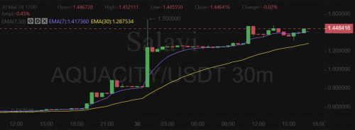 根据 Salavi 平台交易趋线图; Aquacity 在 3 月 29 日和 30 日冲破 1 美元新高,直指全日最高点 1.55 美元,目前稳定横摆在 1.32 美元至 1.44 美元之间。
