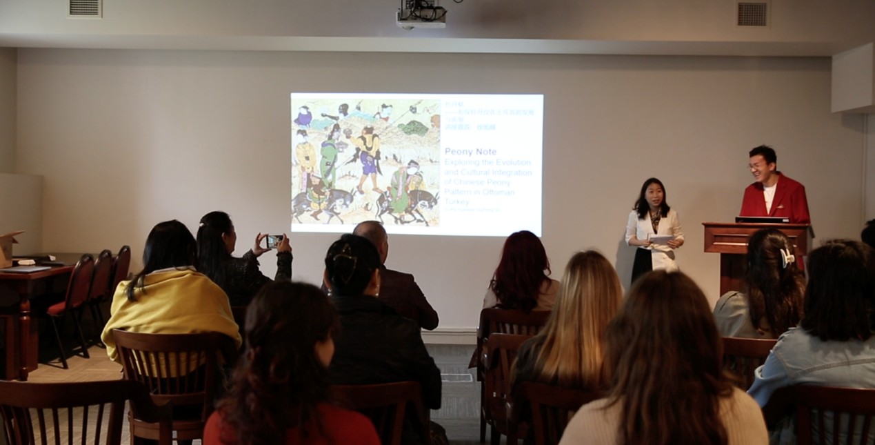 上海书画院学术部主任徐旭峰以“《牡丹赋》——初探牡丹纹在土耳其的发展与面貌”为题,生动讲述牡丹图纹在中国的起源及其通过海上丝绸之路传播至波斯、土耳其的历史轨迹。他从艺术视角阐释牡丹纹在奥斯曼帝国时期的发展与演变,揭示这一传统符号在跨文化交际语境中的延续与活力。讲座结束后,徐旭峰向海峡大学亚洲研究中心赠送其在景德镇创作的釉上彩画作。海峡大学孔子学院土方院长、海峡大学历史系舒月博士代表亚洲研究中心接受赠礼并表达感谢。