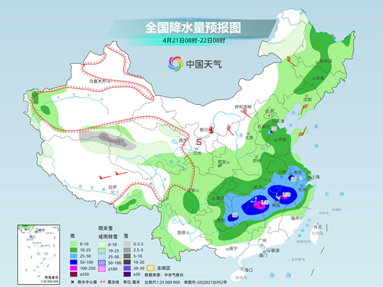 中国天气网讯 今天(4月21日),南方降雨进入过程最强时段,局地将遭遇大暴雨,需警惕强对流天气,同时,北方地区也将出现大范围降水。受较强冷空气影响,今明两天长江中下游及其以北地区气温下降明显并伴有大风天气,多地降温如换季。
