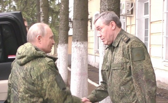 这张克里姆林宫网站3月12日发布的照片显示,俄罗斯总统普京(左)和俄罗斯武装力量总参谋长格拉西莫夫在库尔斯克地区一个指挥中心握手。新华社发(克里姆林宫网站供图)