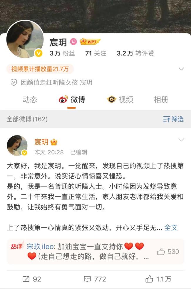 近日,在西安美术学院运动会开幕式上,女大学生宸玥举牌的视频在网络上走红。关于她的长相被质疑的话题迅速冲上微博热搜榜,不少网友称她“美得不真实、不自然,像AI”。4月22日,宸玥通过社交平台回应:“我是一名普通的听障人士。小时候因为发烧导致意外。二十年来我一直正常生活,家人朋友老师都给我关爱和鼓励,让我始终有勇气面对一切。”她坦言接受过加深加宽双眼皮、鼻子磨平驼峰、填充苹果肌三个医美项目,并植过发,“其他的什么都没动过。”对于突然受到网友关注,宸玥表示感到“意外”。