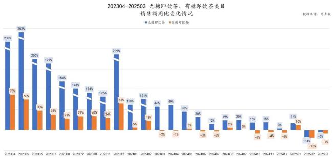 据线下零售检测机构马上赢发布的数据显示,整个即饮茶赛道在今年2月和3月连续两个月销售额同比增速为负。即便是排除春节错位造成影响的1、2月,3月份即饮茶的同比增速依然为负。其中,有糖茶同比增速为-7%,无糖茶同比增速为-5%。