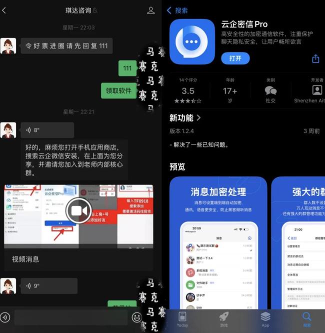 值得注意的是,此类直播平台屡禁不止,在秒封后另一个新的直播间又会马上跳出来。在完成引流后,对方会将上当的投资者从社交媒体引流至微信,再通过微信这个中转站将投资者迅速转移至一个名为“云企密信”的加密聊天软件。