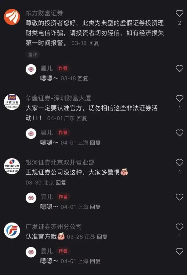 此外,多家证券公司也发布了打假公告,记者发现,为提醒投资者,官方甚至在社交媒体的评论区提示,切勿相信非法证券活动。