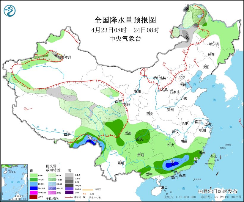 4月23日08时至24日08时,内蒙古东北部、黑龙江西北部、新疆沿天山地区和南疆西部山区、西藏北部、青海中南部、甘肃南部、川西高原北部等地部分地区有小到中雪或雨夹雪,其中,内蒙古东北部、黑龙江西北部等地部分地区有大雪或暴雪(10~15毫米)。江西南部、福建南部、广东中北部、广西东部和中部、川西高原东部、重庆中西部、云南西北部、西藏东南部等地部分地区有中到大雨,其中,西藏东南部、广东北部等地部分地区有暴雨(50~80毫米)。内蒙古中东部、河北北部、辽宁北部、西藏西部等地部分地区有4~6级风。