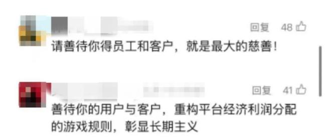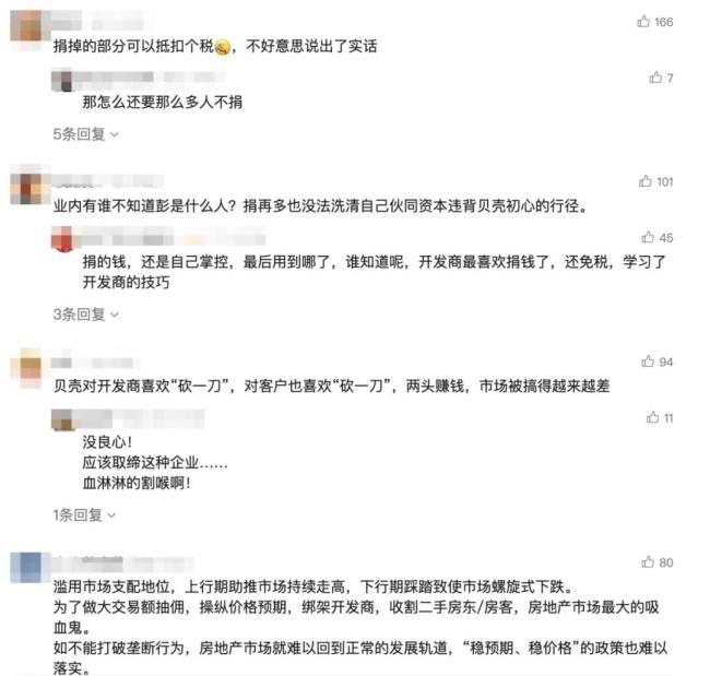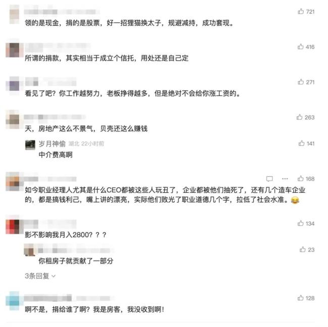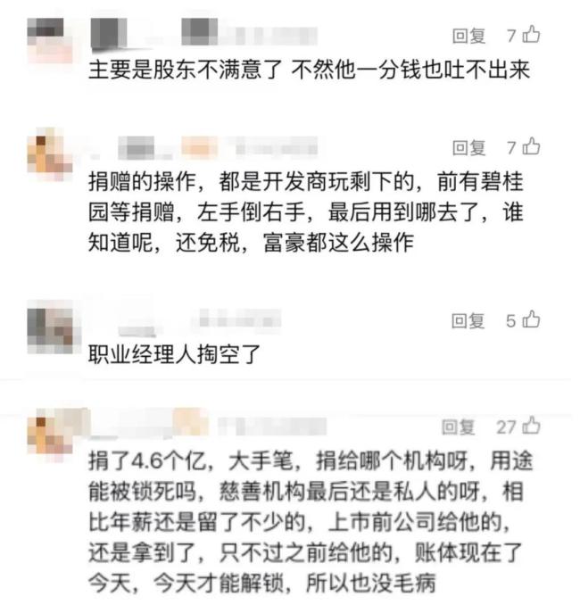 因此,有不少网友质疑其表面捐赠,实则是否为了平息舆论风波。有网友留言称:“捐赠的操作,都是开发商玩剩下的,前有碧桂园等捐赠,左手倒右手,最后用到哪去了谁知道呢,还能免税。”也有人留言“请善待你的员工和客户,就是最大的慈善。”还有网友留言“所谓的捐款,其实相当于成立个信托,用处还是自己定。”