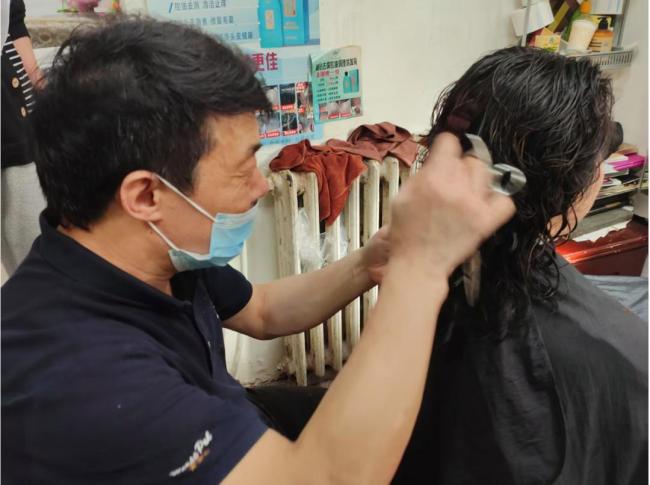 北京工业大学的学生小张几乎每个月都来这儿理发,他说这里价格便宜,手艺也好。居民陈韵飞和他的家人已经在这里剪了好几年头发,是店里的忠实顾客。