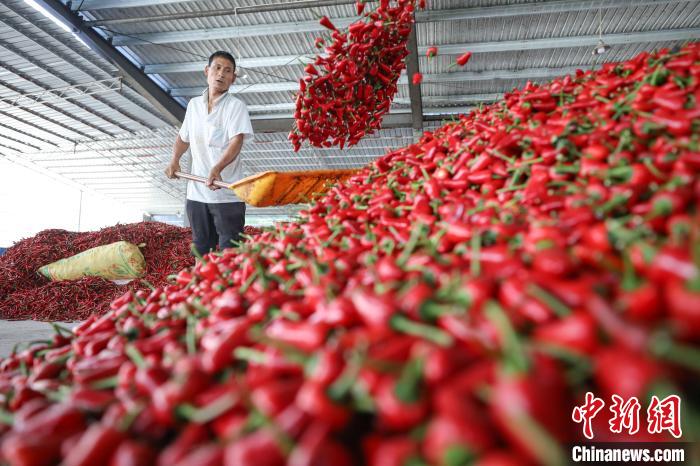 在位于新蒲新区的中国辣椒城内,辣椒加工企业、合作社,工人正在加紧烘干、打包干辣椒发往全国各地。该辣椒城是中国最大的辣椒集散交易中心,年干椒交易量50余万吨,交易额近100亿元,辣椒产业综合产值已超过200亿元,能满足75万吨辣椒年交易量,15万吨农产品交易量,从中国辣椒城进出的辣椒产品销售范围累计遍及80多个国家和地区。一颗辣椒在遵义完成了“华丽转身”。从“小特产”到“大产业”,遵义以辣椒为媒,让世界品尝中国味道。