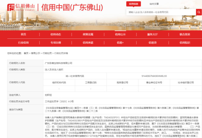 彤美生物在过去一年中多次被通报或处罚。2024年10月,广东药监局发布通告称其生产质量管理体系存在严重缺陷,被依法采取紧急控制措施。同年11月,国家药监局通报其生产的一批次防晒霜未检出产品标签标示的防晒剂。
