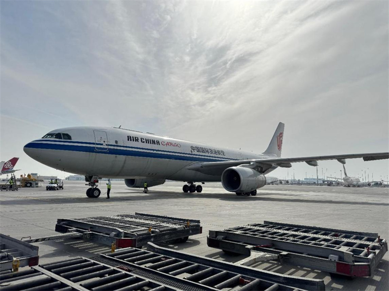 图为4月26日,成都—迪拜货机航线飞机抵达阿勒马克图姆国际机场。 中国国航供图
