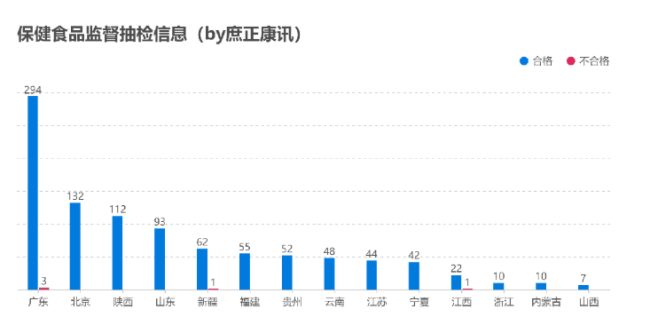 在本次监测的各地抽检信息中,广东省公布的抽检最多共计297批次,其中有3批次抽检不合格;其次是北京市共计132批次;陕西省位居第三共抽检了112批次。