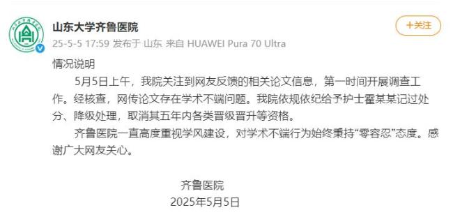 山东大学齐鲁医院于5月5日下午发布情况说明,表示院方已关注到网友反馈的相关论文信息,并立即展开调查。经核查,确认网传论文存在学术不端问题。医院对涉事护士霍某某进行了记过处分、降级处理,并取消其五年内各类晋级晋升资格。