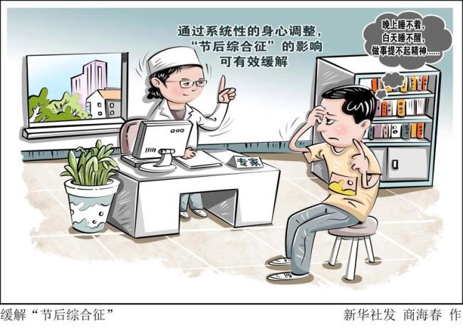 生理上可能出现恶心、头晕、厌食、失眠、困乏等症状;心理上则表现为厌倦、提不起精神,影响工作效率甚至导致焦虑和神经衰弱。这些症状通常由休假期间作息不规律、饮食不当如暴饮暴食及过量饮酒引起,加上外出游玩、走亲访友造成的身体疲劳以及节后突然面对的工作压力等因素共同作用所致。