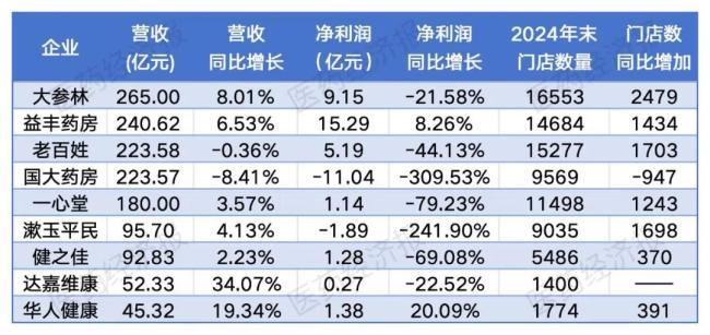 在业内看来,财务数据是企业经营状况与发展趋势的“晴雨表”,反映了其盈利能力、运营效率以及市场地位。2024年,国内上市连锁药店呈现规模扩张与盈利承压并存的格局:一方面通过并购、自建门店等方式,不断扩大市场规模,提升品牌影响力;另一方面,伴随行业竞争加剧、成本上升以及政策调整等因素,企业的盈利能力正面临着较大挑战。