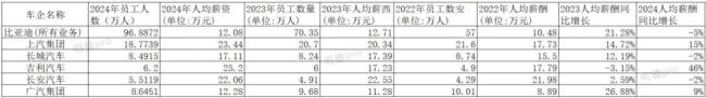 如果从人均工资同比增速来看,在2024年有三家的工资处于增长之中。如果按照上述的年报数据计算,其中吉利增长了46%,增幅很大,其中原因不明。上汽集团在2024年员工平均工资增长了15%,也是唯二的双位数增长。广汽集团在2024年员工平均工资增长了9%。其余三家员工平均工资都有所下滑,其中比亚迪下滑了5%,长城下滑了2%,而长安也下滑了2%。
