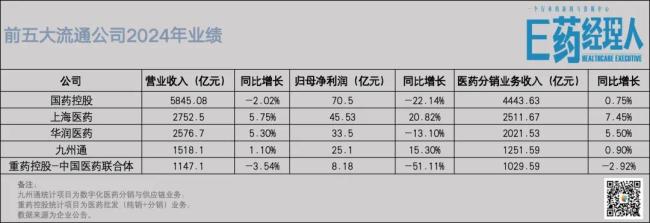 随着4月底九州通发布了2024年年报,流通行业“五巨头”去年的成绩单至此全部公布完毕。按照营收规模和综合实力划分,国内排名TOP5的流通企业分别是国药控股、上海医药、华润医药、九州通和重药控股-中国医药联合体。通过梳理上述企业2024年财报,可看到以下几点趋势: