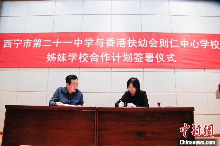 图为西宁市第二十一中学(左)与香港扶幼会则仁中心学校姊妹学校合作计划签署仪式现场。马铭言 摄