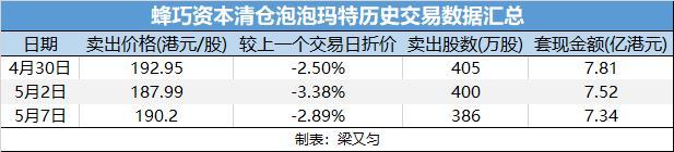 创始股东回应清仓泡泡玛特 长期陪跑终离场!蜂巧资本在其官方公众号宣布,由于蜂巧人民币一期基金即将到期,机构在近一周内通过大宗交易分三次集中出清了所有在上市前买入的泡泡玛特股份,至此基金将不再持有任何泡泡玛特股票。港股泡泡玛特大宗交易历史数据显示,蜂巧资本从4月30日开始套现,至5月7日累计卖出1191万股,占公司总股本0.89%,总套现金额约22.67亿港元(约合人民币21.11亿元)。受大股东接连抛售影响,泡泡玛特5月7日股价下跌5.43%,报收184.5港元/股,最新市值为2478亿港元。