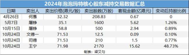回顾2024年泡泡玛特股东减持记录,屠铮的套现早已开始。2024年5月,随着海外市场增长捷报频传,公司股价逐渐回升。屠铮首次减持1600万股,出售价为每股35.1港元,套现约5.62亿港元。同年10月,泡泡玛特股价屡创新高。屠铮再次减持500万股,出售价为每股58.8港元,套现约2.94亿港元。两次减持后,屠铮的持股比例从招股书中的2.85%下降至0.89%。