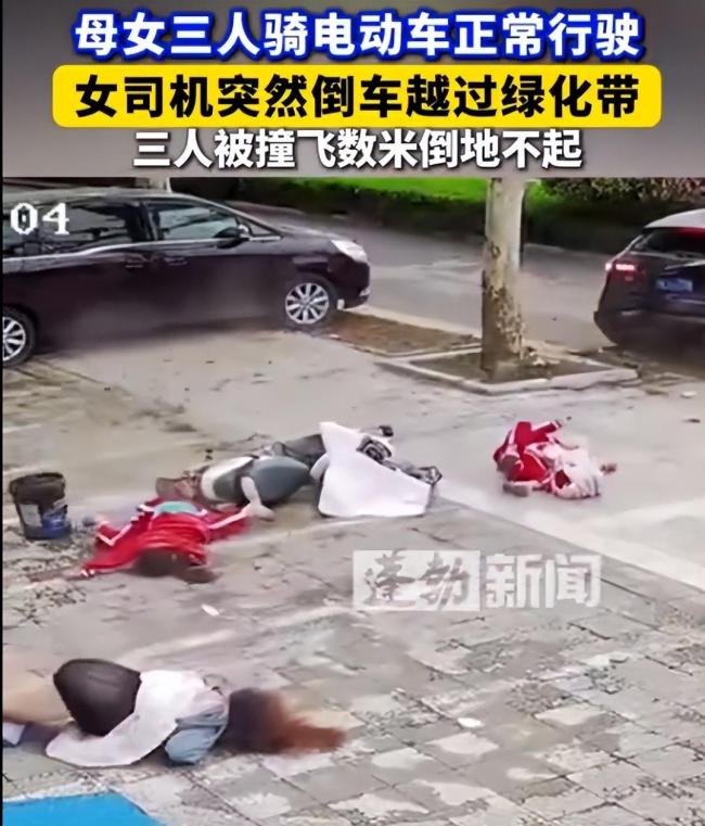 母女三人骑电动车被撞飞 绿化带倒车惹祸