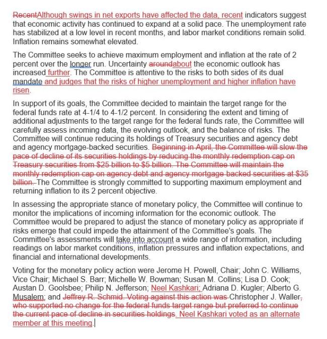 关于缩表,美联储将继续减少其持有的美国国债、机构债和机构MBS。这意味着,在4月开始放慢缩表后,美联储的缩表指引未进一步变动。全体FOMC投票委员都支持本次的决议,既不调整利率,也不再改动缩表。