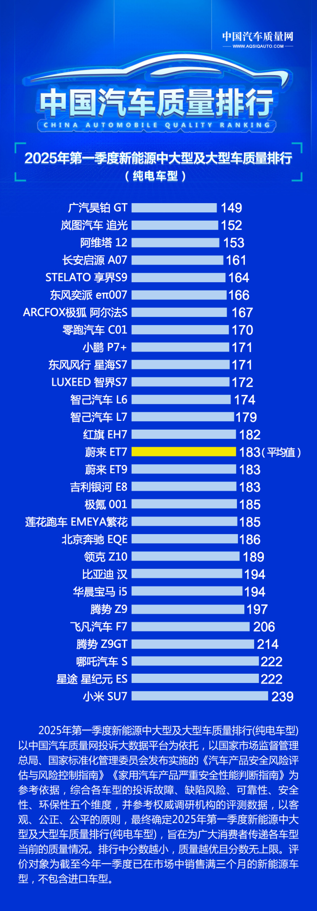 米粉质疑小米SU7质量榜垫底 榜单引发争议!“五一”刚过,两份排行榜让郑州车友群炸开了锅。中国汽车质量网发布的2025年一季度榜单显示,小米首款电动汽车SU7以239分位列最后一名,而广汽昊铂GT、岚图追光等国产车冲进前三;“车质网”发布的《2025年Q1热销新能源车质量排行》则显示,小米SU7的故障率在50款热门新能源汽车中仅高于五菱缤果PLUS,位列第二。