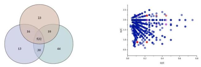 Venn图显示532种共有化合物构成风味基础,但青稞威士忌含44种独有化合物(如Estragole)。Van Krevelen图揭示青稞样本中CHOS和CHON化合物比例更高,反映代谢多样性。图源@原论文