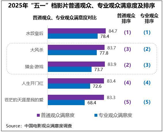 中国电影观众满意度调查・2025年“五一”档调查结果显示,“五一”档电影观众满意度得分83.6分,同比增长0.4分,为近年来同期调查的春季及“五一”档期满意度第一位。2025年“五一”档电影市场延续多元化内容供给,满意度主调查的五部影片类型题材各异,且都以较为优质的创作获得了观众“满意”评价,并首次实现在“五一”档主调查的影片全员突破82分,其中《水饺皇后》以84.3分夺得档期冠军,《大风杀》、《猎金・游戏》分别以83.4分、83.3分居第二、第三位。