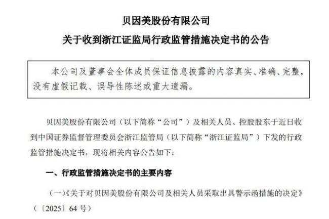 4月16日晚间,贝因美发布公告显示,公司及相关人员、控股股东于近日收到中国证券监督管理委员会浙江监管局下发的行政监管措施决定书。