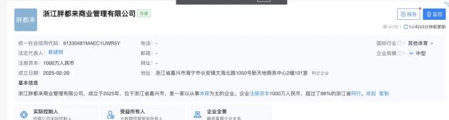 天眼查显示,浙江胖都来商业管理有限公司成立于今年2月,注册资本1000万,浙江艺淘服饰有限公司、浙江盈都文化传媒有限公司分别持股80%、20%,都建明担任法定代表人。