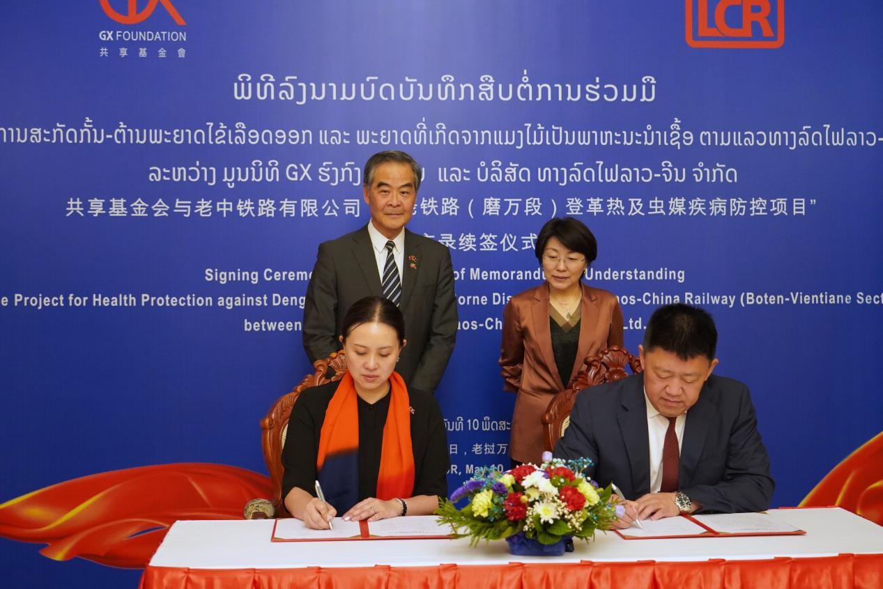 人民网曼谷5月11日电(记者杨一)万象消息:10日,老中铁路有限公司与中国香港共享基金会在老挝万象续签《“中老铁路(磨万段)登革热及虫媒疾病防控项目”合作备忘录》。全国政协副主席、共享基金会主席梁振英,中国驻老挝大使方虹,老中铁路有限公司总经理刘宏等出席续签仪式。