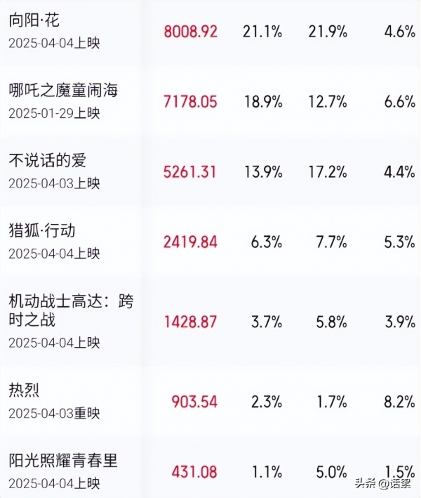部分影院宁愿给《哪吒2》40%排片"保底",也不愿冒险上新片空场。从清明档就可以看出,猫眼数据显示,影院尝试降低《哪吒2》排片至8%以给其他新上电影让路,却仍以20%票房占比逆袭,新上映的悬疑片、爱情片纷纷"一日游",甚至有影院经理自嘲:"现在排片就像押注,赌新片能爆,结果大概率赔钱;不如直接放《哪吒2》,至少不亏。",也验证了市场对新片的极度不信任。