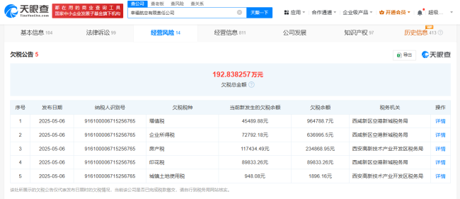 幸福航空欠税192.8万被公告 多税种欠缴引发关注