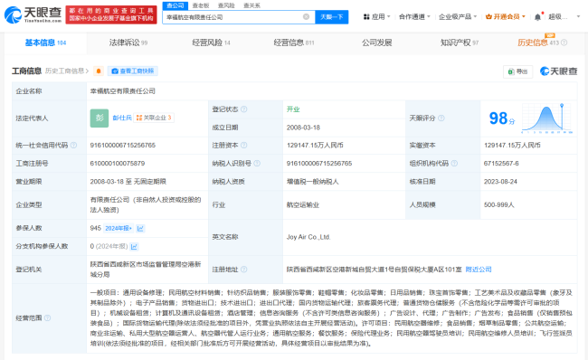 幸福航空有限责任公司成立于2008年3月,法定代表人为彭仕兵,注册资本约为12.9亿人民币。公司的经营范围涵盖通用设备修理、民用航空材料销售、针纺织品销售及服装服饰零售等,由幸福奥凯航空企业管理有限公司全资持股。此前,幸福航空曾被曝出陷入欠薪风波,拖欠员工工资及社保,一些在职飞行员和空乘人员甚至开始做自媒体、直播带货或送外卖等兼职工作以维持生计。