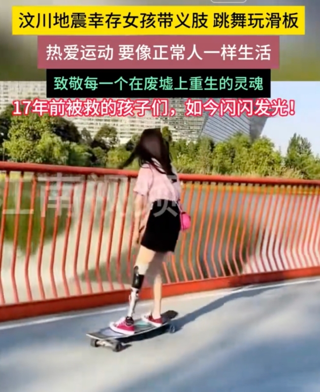 5月12日,四川汶川地震幸存女孩胡月重生第17年,她佩戴义肢跳舞、玩滑板,通过运动和DIY假肢积极生活,表示自己就是正常人。