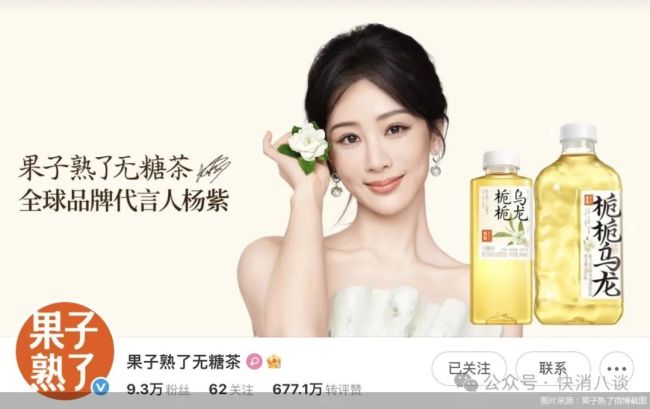 提前启动营销的不止三得利。5月7日,果子熟了官宣杨紫升任“果子熟了无糖茶全球品牌代言人”,品牌强调此次合作基于杨紫的高国民度、健康形象及作品海外影响力,旨在推动中国茶文化国际化。此前2024年5月,杨紫首次担任果子熟了品牌代言人,其代言的“栀栀乌龙”“金桂乌龙”等产品销量猛增。果子熟了官方公布的数据显示,无糖茶一年卖出4亿瓶。