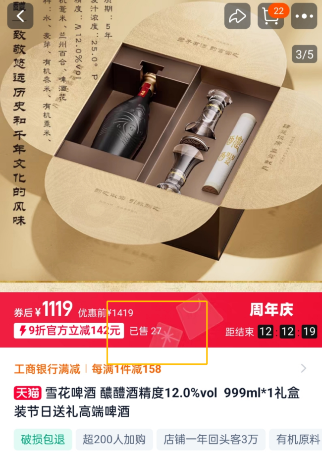 为冲击高端市场,华润曾推出定价 1199 元的超高端啤酒 “醲醴”,但上市一年仅售出 24 瓶,被业界调侃为 “自嗨式创新”。如今,华润依旧没有放弃这款产品,在电商平台依旧有售,只是其官方平台的月销量依旧卡在两位数,销量惨淡。