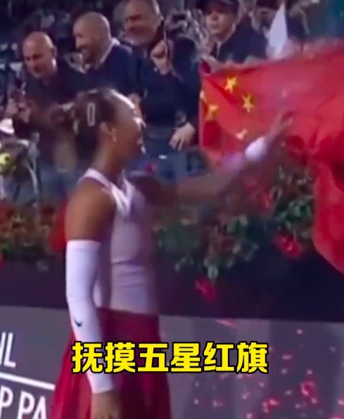 郑钦文在罗马赛后走到场边,轻轻触碰球迷手中的国旗并低头亲吻。