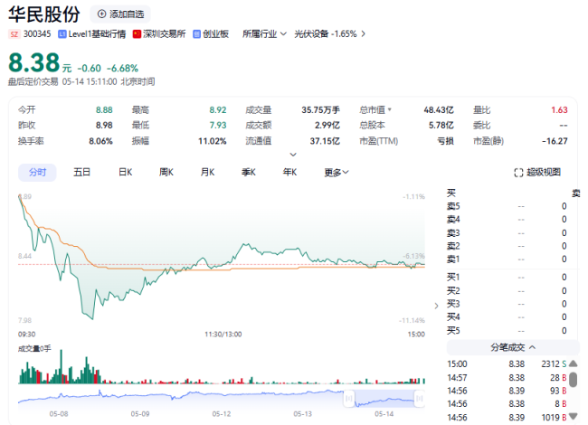 5月14日,光伏设备板块震荡走低,板块中华民股份(300345)盘中跌超10%。