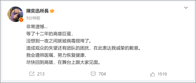 陈奕迅确诊新冠 演唱会延期 Eason遗憾发声!5月15日,陈奕迅Fear and Dreams巡回演唱会官方微博发布延期公告。歌手陈奕迅因突感身体不适,经医生诊断确诊为新冠肺炎,需立即停止所有演出活动并进行休养。面对突如其来的病毒侵袭,确定首周无法如期重返高雄,陈奕迅非常难过也深感歉意。演唱会团队已紧急协调后续安排,原定于5月16、17、18日在高雄巨蛋举行的三场演出将延期举行。