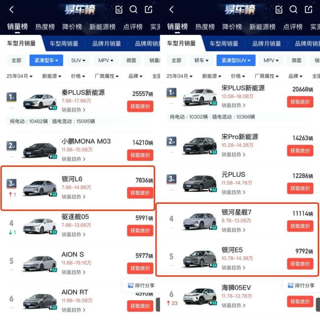 从产品布局来看,不仅仅是小型车市场,吉利在多个主流细分市场,已经对比亚迪的市场位置形成极大压力。在紧凑型新能源轿车市场,银河L6与秦PLUS新能源、驱逐舰05两款车型直接对打。在4月份,银河L6已经以7836辆的成绩,首次超越了驱逐舰05,跻身这一细分市场TOP3。