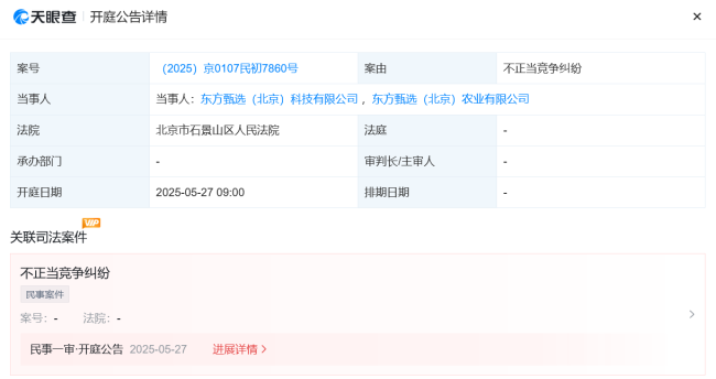 天眼查法律诉讼信息显示,东方甄选(北京)科技有限公司与东方甄选(北京)农业有限公司之间的不正当竞争纠纷案件新增开庭公告。原告为东方甄选(北京)科技有限公司,此案定于5月27日在北京市石景山区人民法院开庭审理。